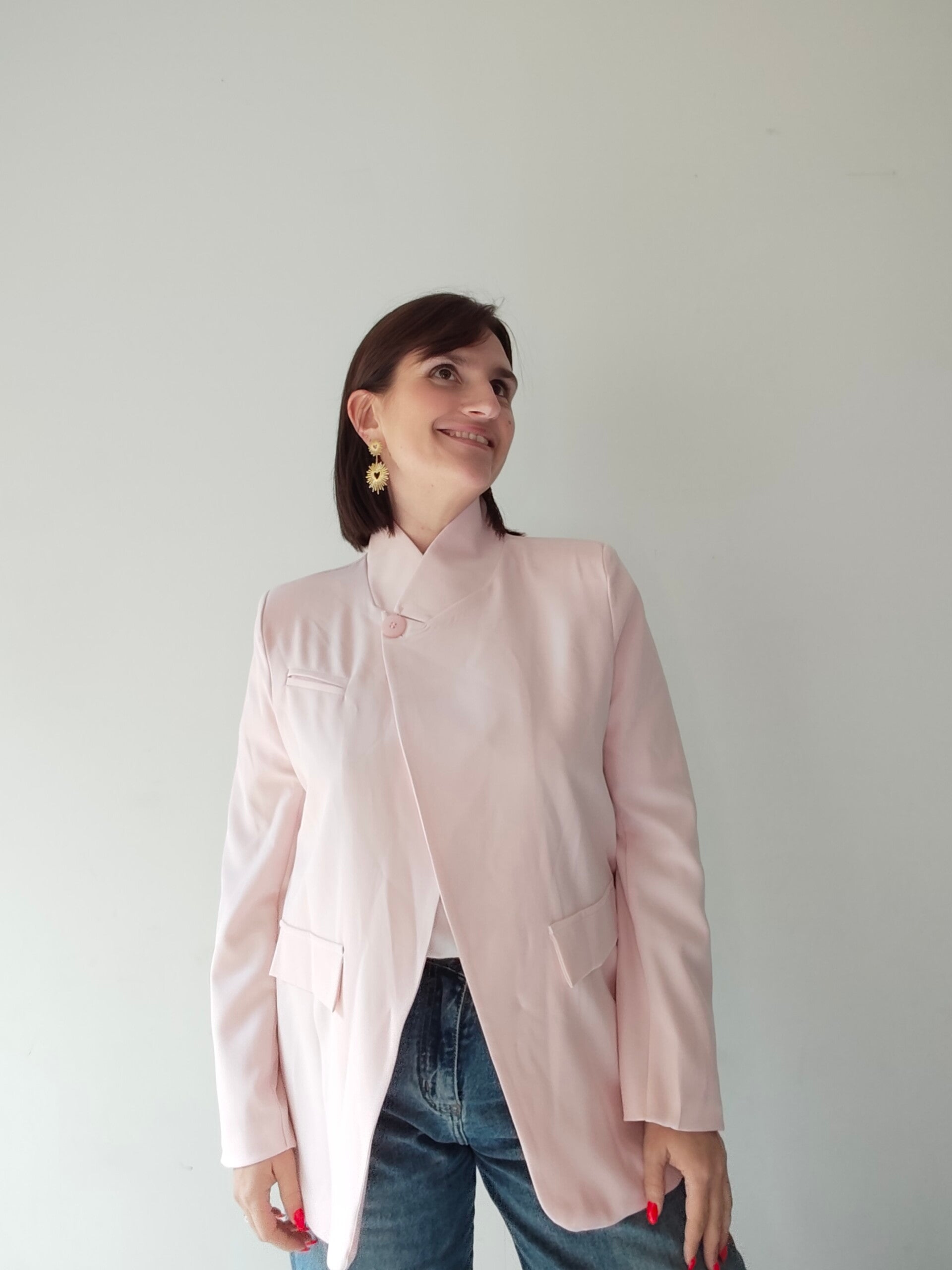 . S'attache avec une bouton asymétrique ou bien on peut le laisser en blazer classique.